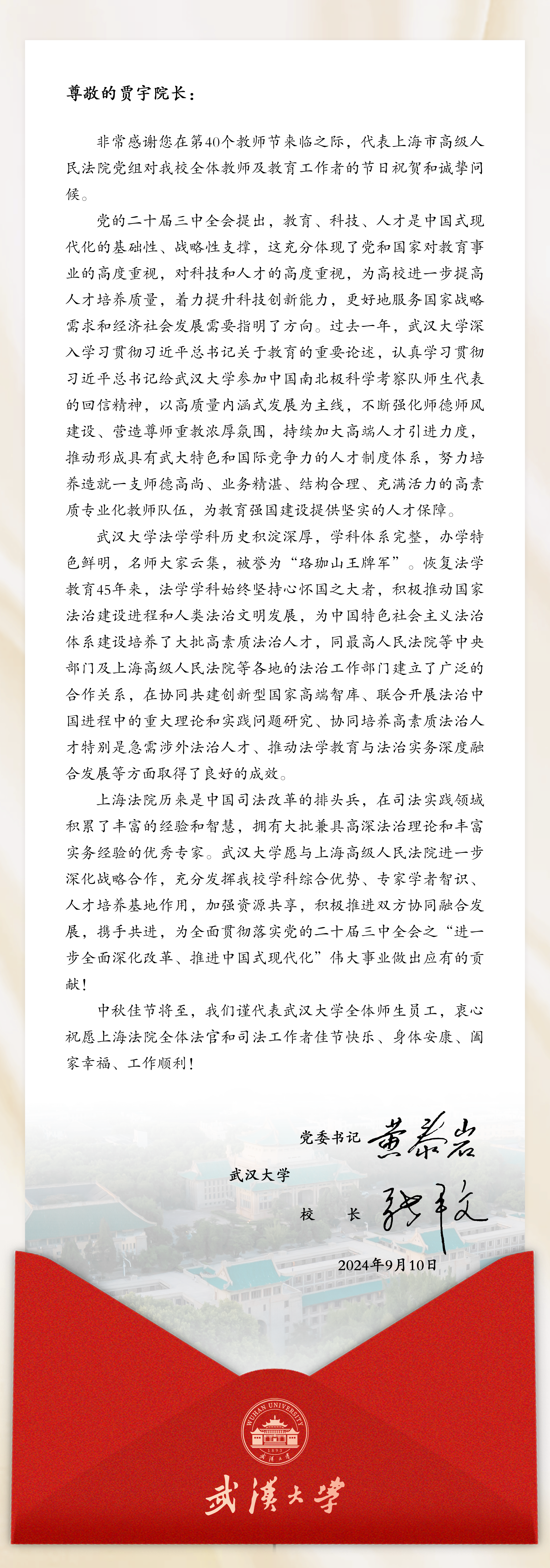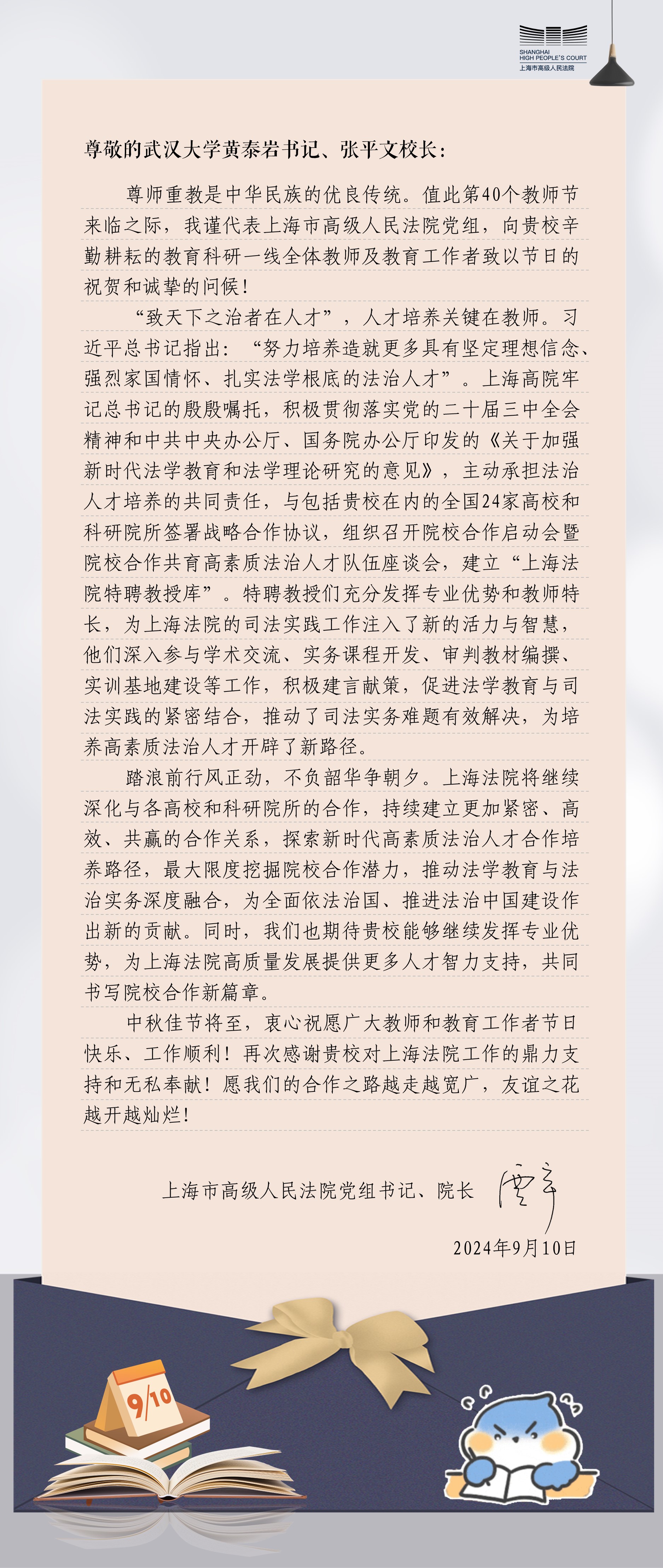 9月10日是国家第40个教师节,当天,上海市高级人民法院党组书记、院长贾宇代表该院向我校全体教师和教育工作者致以节日的祝贺和诚挚的问候。贾宇院长高度评价上海市高级人民法院和成人影视片