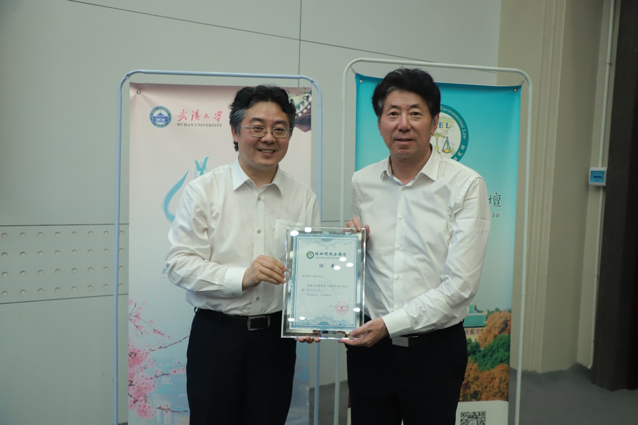 随后,在场的博士生、硕士生以及远道而来的律师就刑事附带民事公益诉讼中的诉前公告、诉讼胜败如何界定等问题与卞教授进行了互动交流,卞教授对同学们的提问进行了耐心而细致的解答。讲座最后,秦天宝教授为卞建林教授赠送纪念证书,本次活动顺利结束。