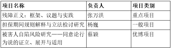 获批3项,其中,重点项目1项,一般项目1项,优秀博士论文出版项目1项。张万洪教授申报的“残障正义:框架、议题与实践”获重点项目资助,杨巍副教授申报的“担保期间规则解释与立法检讨研究”获一般项目资助,蔡颖讲师、博士后申报的“被害人自陷风险研究——同意论行为说的证立、展开与适用”获优秀博士论文出版项目资助。