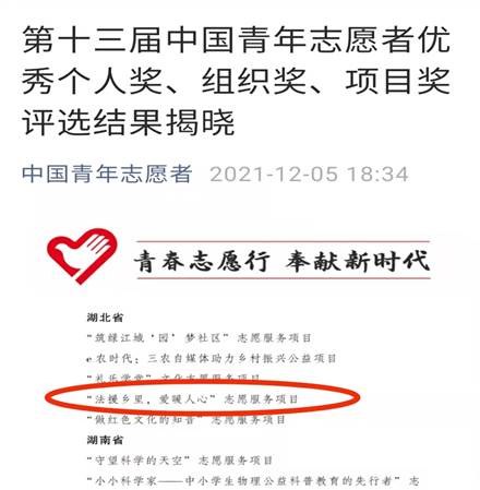 (图为第十三届中国青年志愿者优秀项目奖获奖通知)