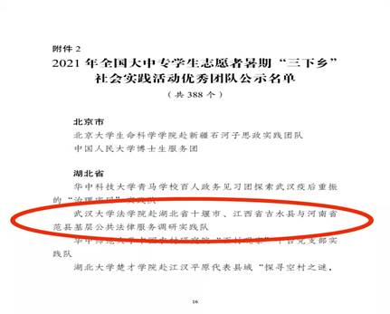 赴湖北省十堰市、江西省吉水县与河南省范县基层公共法律服务调研实践队进入2021年全国大中专学生志愿者暑期“三下乡”社会实践活动优秀团队公示名单。
