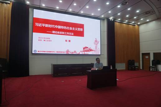 教授、2019年湖北省五四青年奖章获得者祝捷主讲。讲座主题为《习近平新时代中国特色社会主义思想——理论体系和工作方法》,祝捷教授从总体概览、伟大成就、主要内容、思想方法四个板块深入讲授习近平新时代中国特色社会主义思想,深刻剖析四个坚持、七个讲清楚、八个明确等重要概念的本质内涵,让在场师生都深受启发。