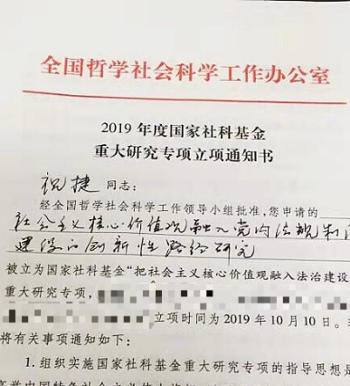 近日,2019年度国家社科基金重大研究专项立项结果揭晓,以祝捷教授为首席专家的《社会主义核心价值观融入党内法规制度建设的创新性路径研究》项目获2019年度国家社科基金重大研究专项立项。
