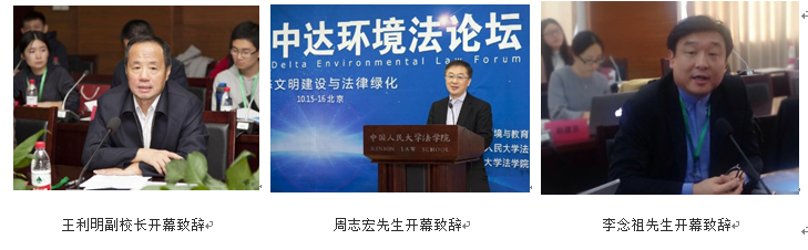 竺效教授主持开幕式。王利明副校长、周志宏先生、李念祖先生发表了致辞。王利明副校长对“中达环境法论坛”的召开表示祝贺,并感谢台达环境与教育基金会在推动环境法学科研究做出的贡献。他表示,今年中央提出了五位一体的布局和五大发展理念,在这样的背景下,探讨生态环境建设和法律绿化命题显得格外重要。环境保护关系到人民的福祉,关系到中国的未来,作为法律人要将推动环境立法,推动生态文明建设当成重要使命。周志宏先生在开幕致辞中表示,《巴黎协议》将于今年11月4日正式生效,这份建章立制的协议将是全球应对气候变化的关键一步,缔约国也将面临新的环境法规和能源政策问题。未来台达还将持续通过绿色产品节能、运营网点节能、和绿色建筑节能三个面向,在2020年前将单位产值用电量(用电密集度)再下降30%。同时通过支持中达环境法学者计划、台达杯国际太阳能建筑设计竞赛等环境公益项目,推己及人,支持环境保护制度的完善与实施。