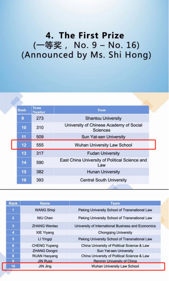 ‘A time will come to ride the wind and cleave the waves; I'll set my cloud-white sail and cross the sea which rave.� The persistent efforts of the team members finally led to a rewarding competition. In the preliminary competition, our school team performed well. With solid knowledge of international law, fluent English expression ability and flexible response ability, our school team was recognized and praised by the judge for many times. With four wins, the team ranked 12th and advanced to the knockout round of 16. In the 16-8 competition, our school team encountered China University of Political Science and Law, the third place in the domestic selection competition. The CUPL team represented Aglovale as the attorney for the plaintiff in court. In the face of continuous questioning by the judge, Chen Yulin and Jin Jing remained calm and responded to the questions clearly. Although we lost by a narrow margin, it has fully demonstrated the Legal literacy and Literature retrieval ability of our school team and won the national first prize. At the same time, Jin Jing won the Best Oralist and ranked 10th among the 20 best debaters in China. Although it was a little regrettable that our team has not entered the international competition, our school team became more and more brave in each competition and gradually got better. The discussion with the judge on the competition question produced a spark of thinking, which benefited the team members a lot and made them realize the lack of legal search depth, interdisciplinary knowledge reserve and courtroom argument skills.
