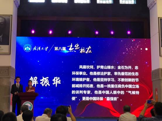 解振校友长期负责中国的环境保护、资源节约、节能减排和应对气候变化事务,为促进中国的绿色低碳、可持续发展和生态文明建设,推动全球环境和气候治理作出了卓越贡献。2007年以来,解振华先生连续超过十年带领中国谈判团队不懈努力,为气候变化《巴黎协定》的达成、签署和生效发挥了突出的作用。他还推动中国与30多个国家、地区和国际组织在节能减排、绿色低碳等领域开展务实合作,为100多个发展中国家培训了千余名应对气候变化领域的官员和技术人员。