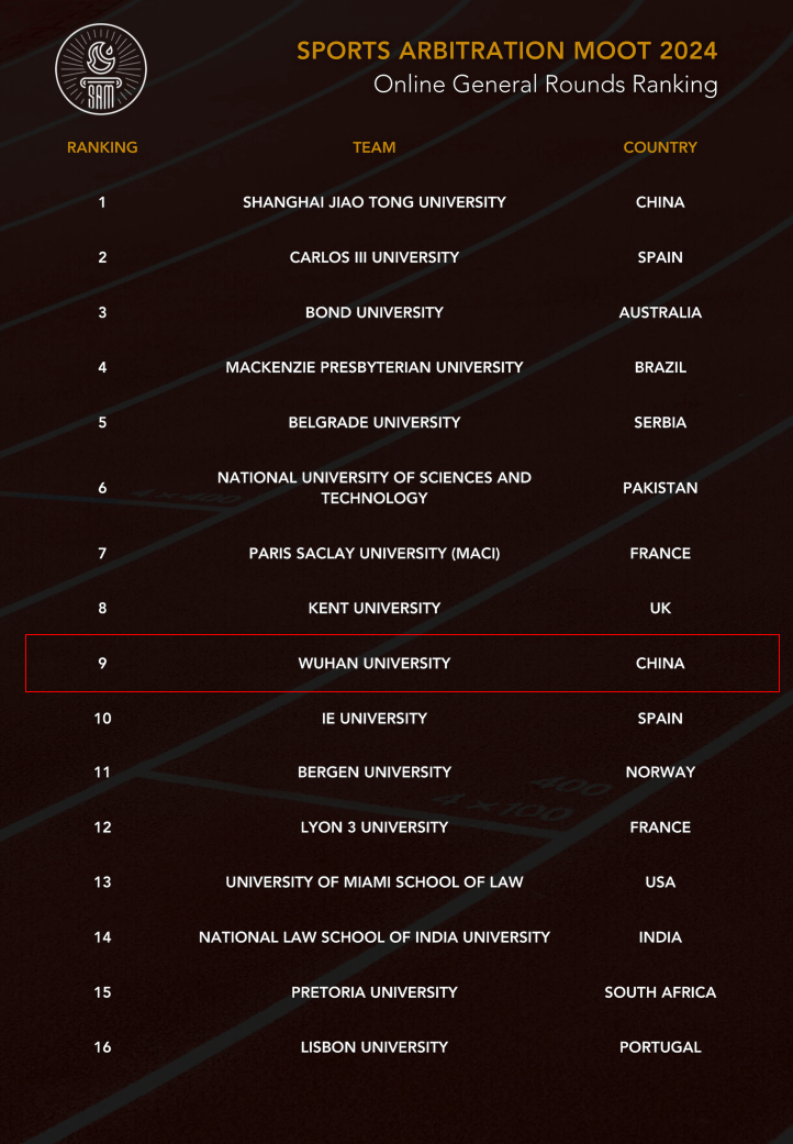 From March 4 to March 15, the preliminary rounds of the 3rd International Sports Arbitration Moot (SAM) were successfully held online. Organized by Fédération Internationale de Football Association (FIFA), Swiss Arbitration Academy and Université de Neuchâtel, the event attracted 71 university teams from all over the world. It attracted 71 university teams from all over the world, including Peking University, Shanghai Jiao Tong University, Nanjing University, China University of Political Science and Law, Zhongnan University of Economics and Law, East China University of Political Science and Law and other domestic institutions, as well as Queen Mary University of London, University of Miami, University of Lyon III, Singapore Management University, Bond University and other world-famous universities. This is the first time for our team to participate in this event. After three heated preliminary rounds, our team was selected as one of the top 16 in the preliminary round with a global score of 9th, and successfully advanced to the knockout round to be held in Madrid, Spain in late May, becoming one of the only two Chinese teams to advance in this tournament.