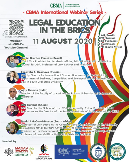 CENTRO BRASILEIRO DE MEDIACAO E ARBITRAGEM (CBMA) and chaired by Prof. Daniel Brantes Ferreira, Vice President for Academic Affairs of the CBMA, and was attended by Prof. Elizaveta A Gromoa, Deputy Director of the International Cooperation Division of the Law School of the South Ural State University, Russia; Prof. Ajay Tomas, Dean of the Law School of the Manay Rachna University, India; Prof. David McQuiod-Mason from KwaZulu-Natal University, South Africa, and Prof. Qin Tianbao were the keynote speakers and exchanged their views on the legal system of their countries, legal education, legal professional examinations, and teaching and research in law schools under the epidemic.