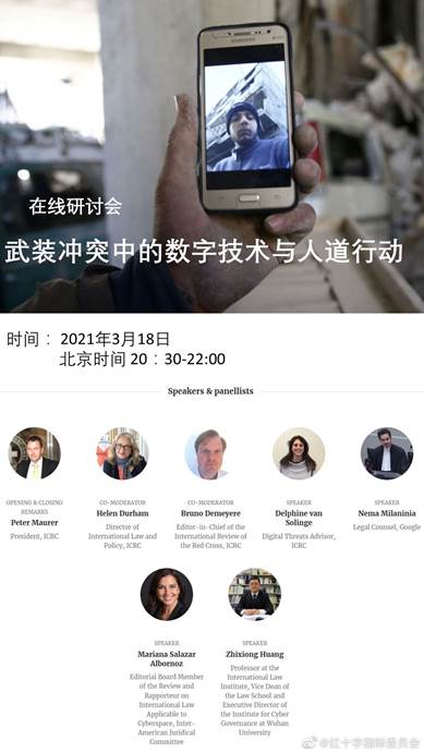 Prof. Huang Zhixiong was invited to participate in an online seminar on "Digital Technologies and Humanitarian Action in Armed Conflict" organized by The International Committee of the Red Cross (ICRC) and the International Review of the Red Cross (IRRC), and delivered a keynote speech on the application of the principle of distinction in cyber armed conflict On 18 March.