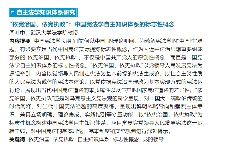 周叶中教授论文《“依宪治国、依宪执政”:中国宪法学自主知识体系的标志性概念》发表在法学界权威期刊《中国法学》2025年第5期。该文为周叶中教授主持的 2024年度国家社科基金重大项目“党内法规在国家治理体系和治理能力现代化中的独特地位和作用研究”(项目批准号:24&ZD125)的阶段性成果。