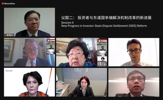 Session II, "New Progress in Investor-State Dispute Settlement (ISDS) Reform", was moderated by Mr. Zhang Xin, Partner of Global Law Firm and Vice-Chairman of the Permanent Forum. Prof. Zhang Yuejiao, Director of the Institute of International Dispute Resolution of Tsinghua University and Chairman of the Advisory Committee of the Permanent Forum, Mr. Alexis MOURRE, President of the Arbitration Institute of the International Chamber of Commerce, Mr. Jakob RAGNWALDH, Vice-President of the Arbitration Institute of the Stockholm Chamber of Commerce and Partner of Mannheimer Swartling, Dr. Claudia ANNACKER, Director of the Vienna International Arbitration Centre and Partner of Dechert Law Firm. Dr. Claudia ANNACKER, Partner of Dechert Law Firm, Mr. Sun Huawei, Partner of Zhonglun Law Firm and Vice Chairman of the Permanent Forum, Mr. Ren Qing, Partner of Global Law Firm and Deputy Secretary General of the Permanent Forum, participated in the discussion.