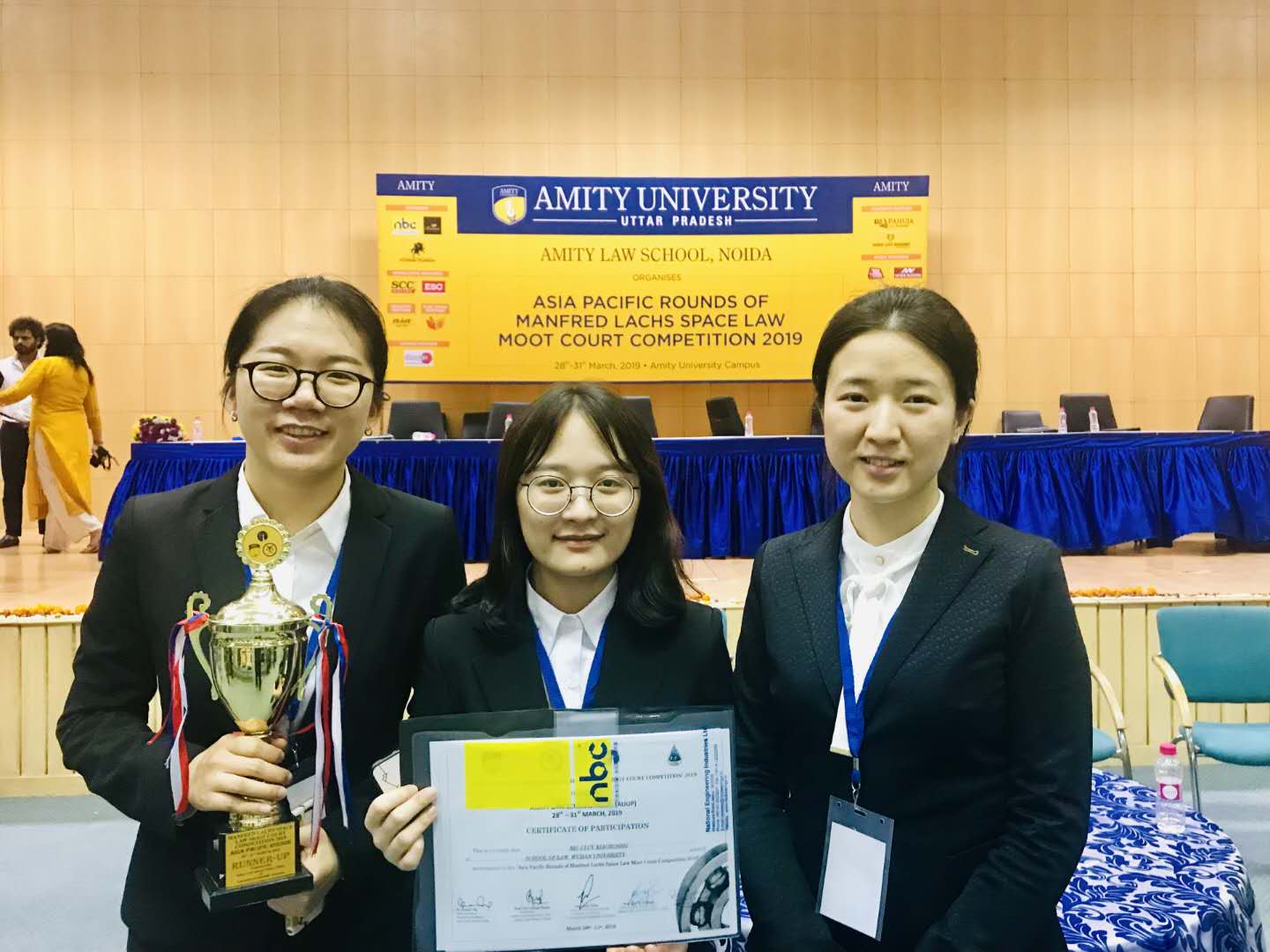 The Asia-Pacific Competition of Manfred Lachs International Space Law Moot Court was held at Amity University in Noida, India, from Mar.28 to Mar.31 in 2019. It is reported that 36 teams from China, India, Singapore, New Zealand, Australia, Japan, Indonesia, Nepal and other countries participated in the competition. Chen Jiangnan, Lv Xiaorong, and Liu Jiachen, post-graduate students of Wuhan university School of Law, won the runner-up in the Asia-Pacific Competition successfully under the guidance and assistance of Professor Su Jinyuan form Xi'an Jiaotong University and Ying Yaohui, Grade 2016 post-graduate student. This was also the best grade for the Chinese team ever got in the Asia-Pacific Competition.