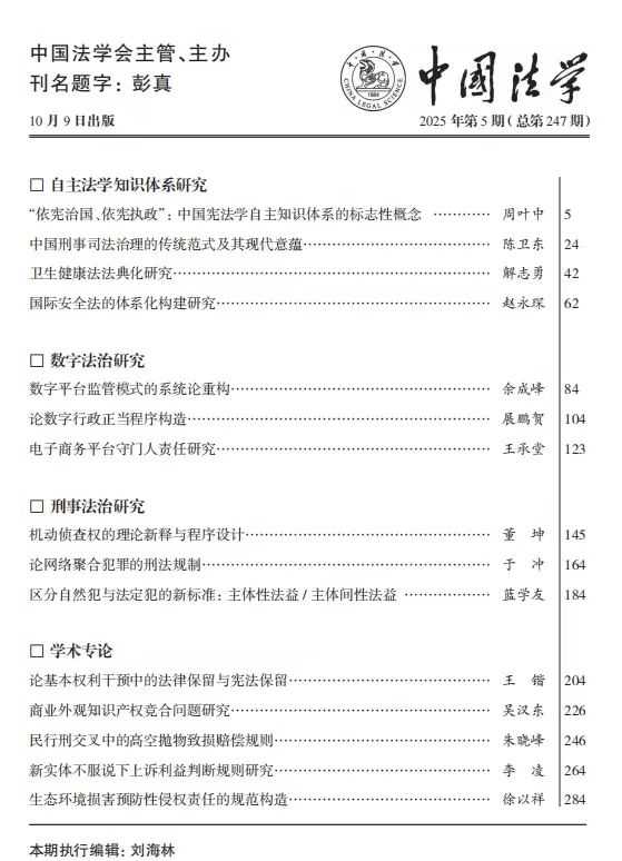 周叶中教授论文《“依宪治国、依宪执政”:中国宪法学自主知识体系的标志性概念》发表在法学界权威期刊《中国法学》2025年第5期。该文为周叶中教授主持的 2024年度国家社科基金重大项目“党内法规在国家治理体系和治理能力现代化中的独特地位和作用研究”(项目批准号:24&ZD125)的阶段性成果。